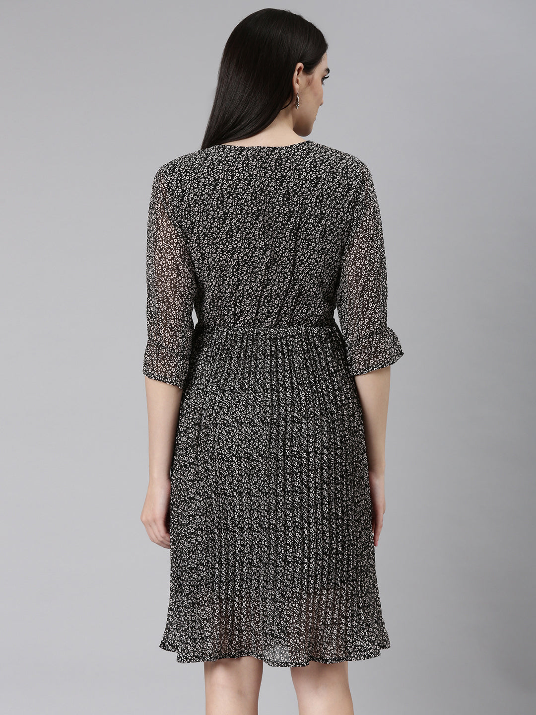 Women's Black Floral Printed Accordion Pleated Ruffled Georgette Fit & Flare Dress