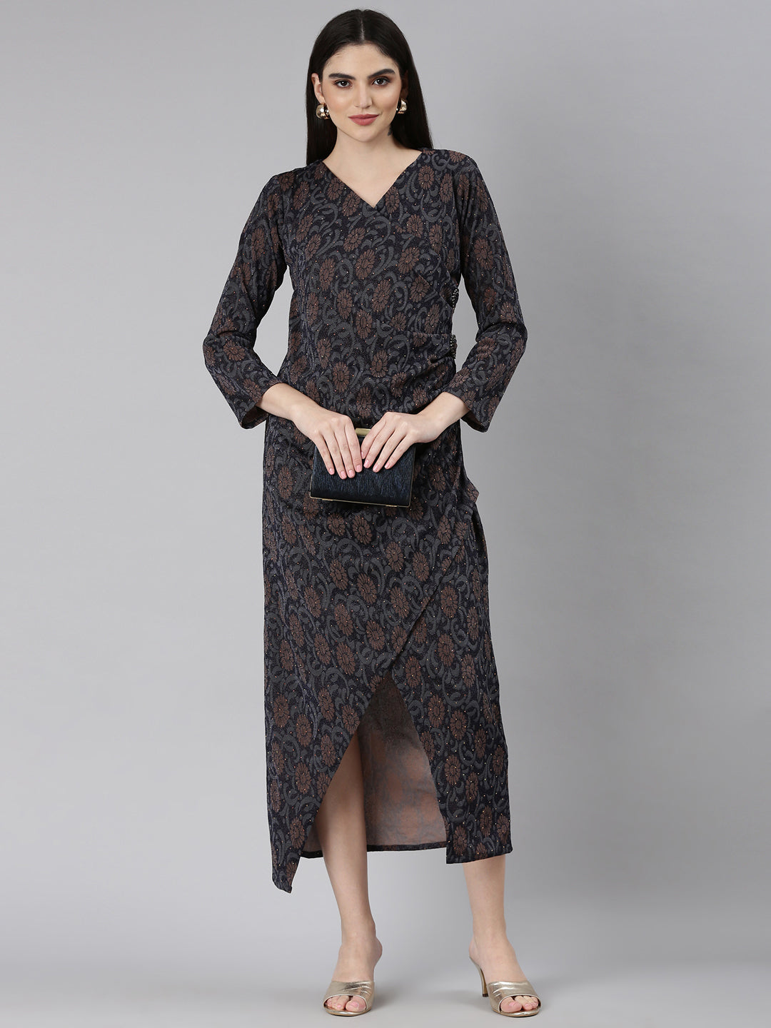 Women's Navy Blue Ethnic Motifs Print Bell Sleeves Dress