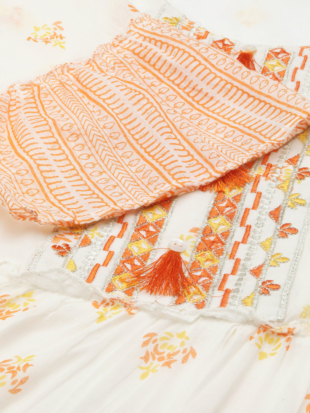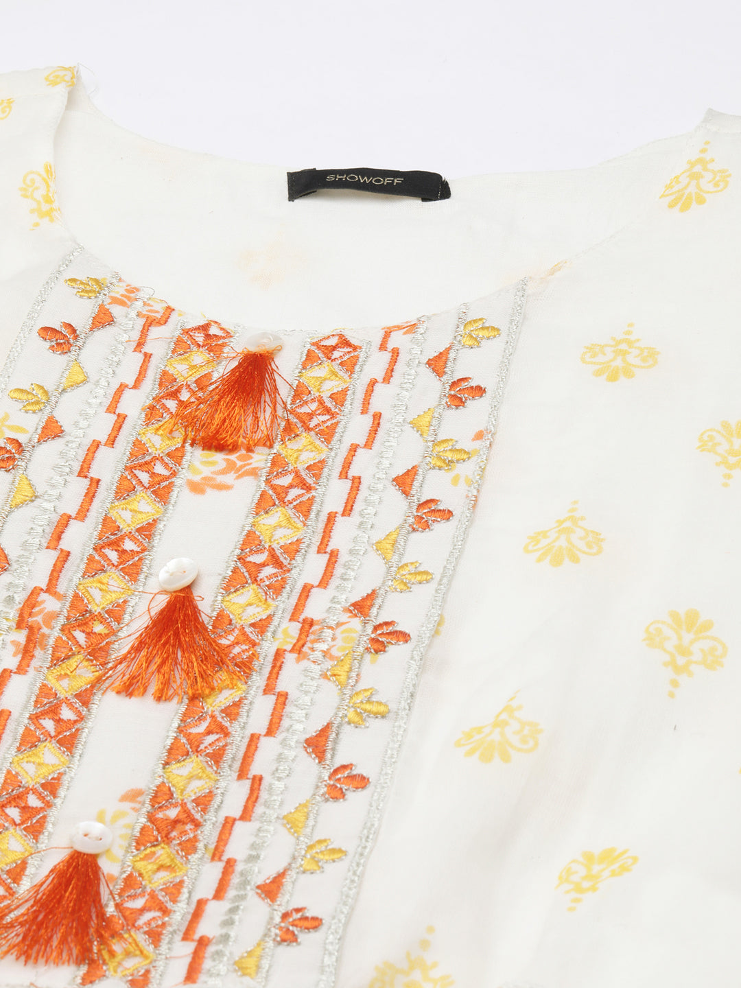 - Charming off-white color with intricate prints adds a touch of sophistication.