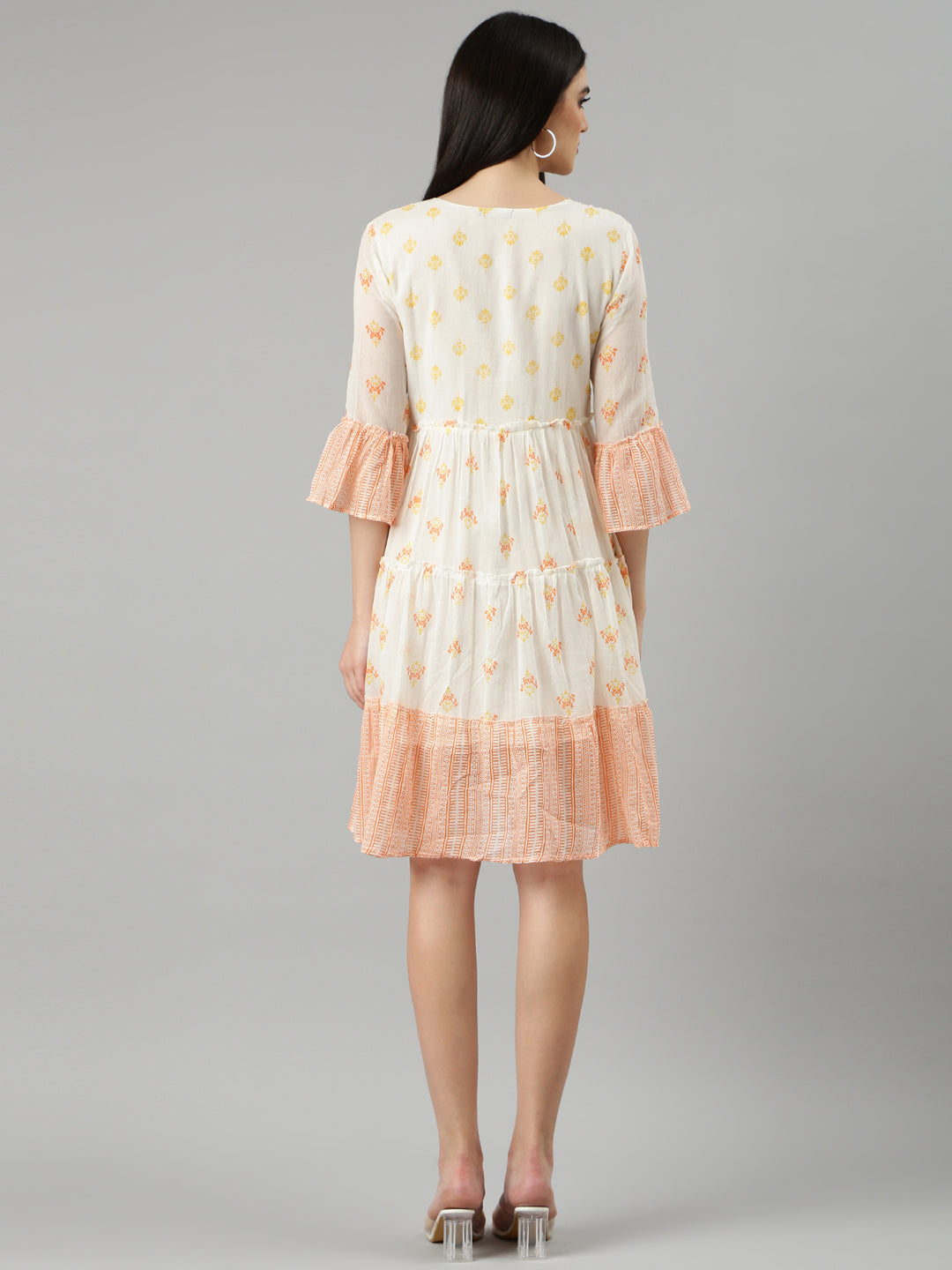 Women's Off White Floral Printed Bell Sleeve Fit and Flare Dress