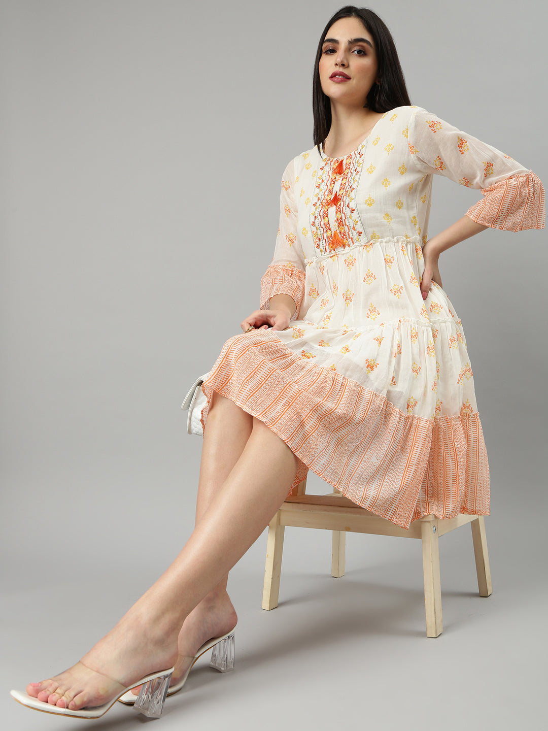 Discover the elegance of our Women Off White Printed Fit and Flare Dress. designed to make you feel effortlessly chic on any occasion. This dress combines a flattering silhouette with unique prints for an eye-catching look that's perfect for both casual outings and special events.