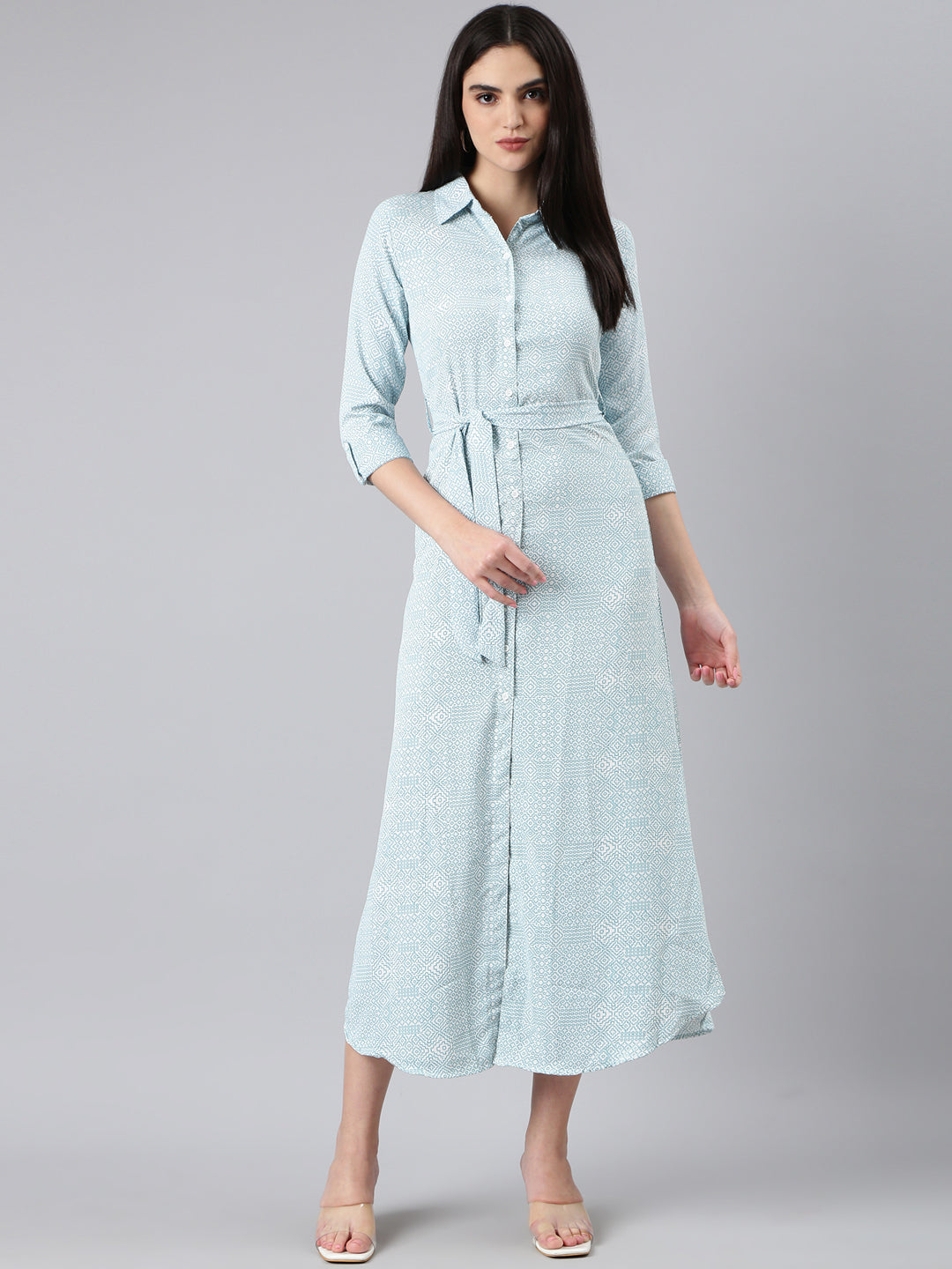 Women's White Geometric Printed Shirt Collar Roll-Up Sleeves Belted Midi Shirt Dress